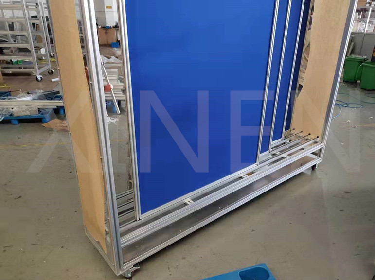 鋁型材移動(dòng)白板是用來展示欄或宣傳欄使用的,此款白板架子選用工業(yè)鋁型材、吊軌吊輪、白板搭配,